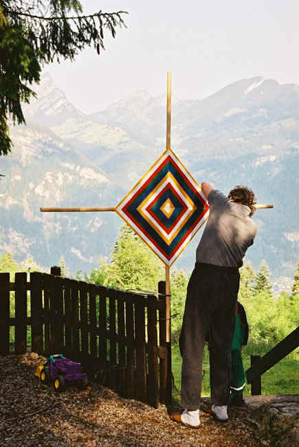 Each diamond-shaped section of a namkha is called a ‘sky’. The elements are woven in the order of earth, water, fire, air and space to decrease the element. The sky begins with the element to be worked upon, starting with that colour in the centre of the sky. To increase the element the colours are woven from the centre in the opposite order. Earth is yellow, water is white, fire is red, air is green and space is blue.
