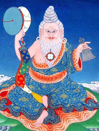 Rang-rig Togden sits upon a tiger skin in the manner of many of the mahasiddhas in the ancient Indian tradition. He has bare feet in similar style – as do many of the representations of Aro gTér Lamas. He wears conch earrings and has his hair piled up on his head.