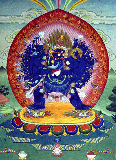 Dorje Shin-je-shèd (rDo rJe gShin rJe gshed) is the one who destroys the concept of death as being ‘separate from birth’. Dorje Shin-je-shèd is the dark blue colour of space and wields the entire assemblage of vajra weapons in his thirty-two arms. His main face is that of a blue yak, surmounted by a red wrathful face, surmounted again by the yellow face of Jampalyang (Manjushri). This describes the manner in which the concept of death is overthrown by the wrathful intelligence of Jampalyang. Dorje Shin-je-shèd exemplifies the knowledge that death and birth are inseparably linked. Dorje Shin-je-shèd is shown here in the form of Pawo Chigpa (dPa bo gCig pa) – the Gélug form called ‘Solitary Hero’. In the Nyingma tradition he is more commonly depicted in his yab-yum manifestation.